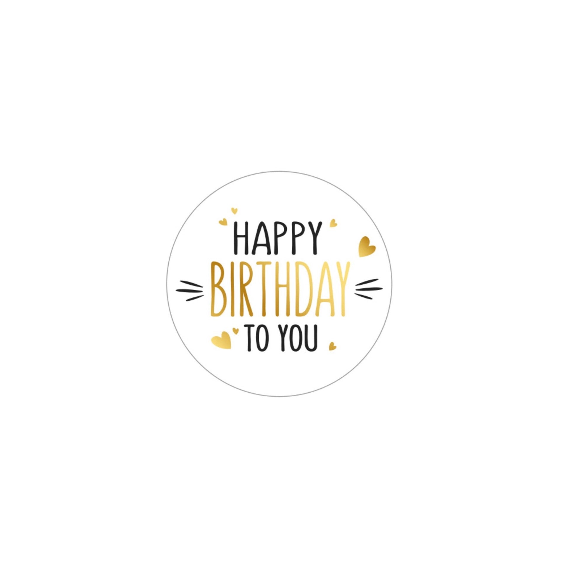 Een feestelijke, moderne sticker met een speelse mix van wit,zwart en goud. De subtiele hartjes maken het ontwerp warm en vrolijk — ideaal voor elke verjaardag.